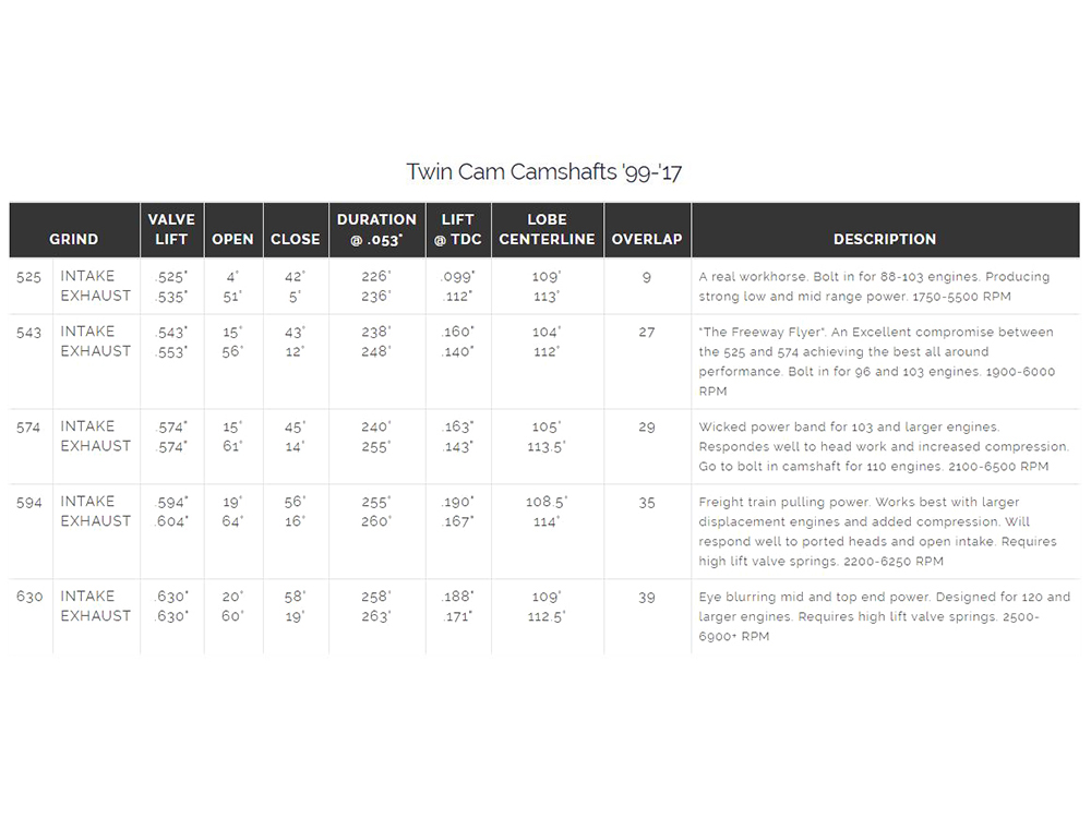 574 CAMS – Wicked power band for modified engines and an excellent bolt in for stock 103 & 110 engines. This is a great all around camshaft with solid mid range performance and mind blowing top end power. Extremely smooth cam lobe design creates a very smooth valve-train motion. Responds very well to modified cylinder heads, increased compression ratio, performance exhaust and intake systems. Performance pushrods, lifters and clutch are recommended. RPM 2,500 – 6,500