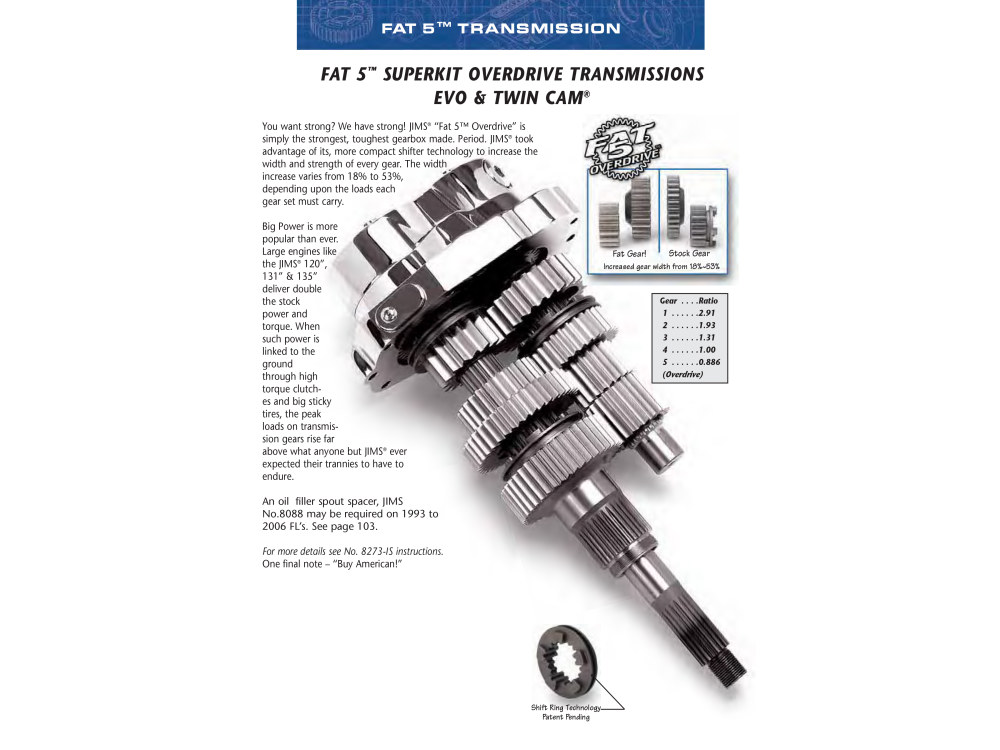 Got strong? We have strong! JIMS Fat 5 Overdrive is simply the strongest, toughest gearbox made. Period. JIMS took advantage of its new, more compact shifter technology to increase the width and strength of every gear. The width increase varies from 18% to 53%, depending upon the loads each gear set must carry. Big power is more popular than ever. Large engines like the JIMS 135Â’ deliver double the stock power and torque. When su ch power is linked to the ground through high torque clutches and big sticky tires, the peak loads on transmission gears rise far above what anyone but JIMS ever expected their trannies would need to endure. All are available with a mechanical clutch activated system only.