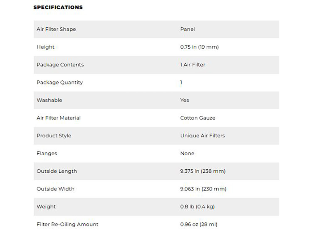 * Fits directly into OEM air box with application specific sealing bead ensuring a precise fit