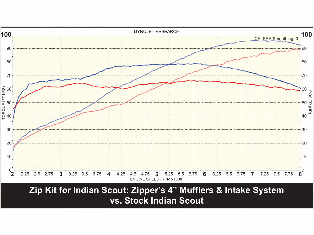 ZipperÂ’s knows that to make maximum power, your engine needs to breathe deep – both in and out! The factory-equipped airbox flows an impressive 331 CFM – but it is designed to reduce intake noise, which creates a long, twisting road from the air filter to the throttle body. ZipperÂ’s MaxFlow air filter system, at 555 CFM, is designed exclusively for performance, and does not yield any noticeable intake noise while out-flowing the factory intake by 40%! Where the stock design is full of sharp turn s and narrow passages, our wide mouth velocity stack design with conical filter promotes smooth, turbulence-free flow directly to the throttle body. This instantly available clean column of air results in rapid acceleration with improved torque, horsepower and throttle response. When paired with a tuner and a set of slip-on mufflers, this system transforms the powerband and the riding experience of the Scout, gaining as much as 17 ft-lbs of torque and 15 hp where you ride!