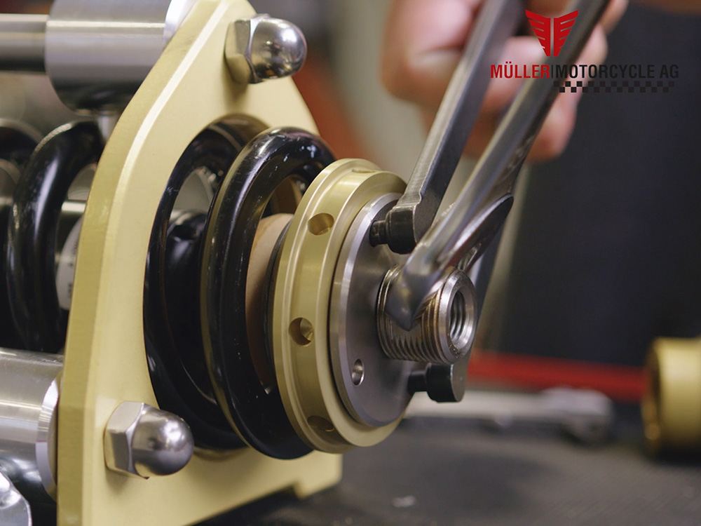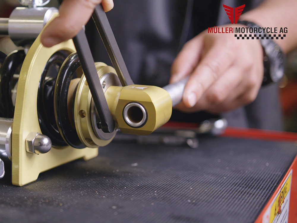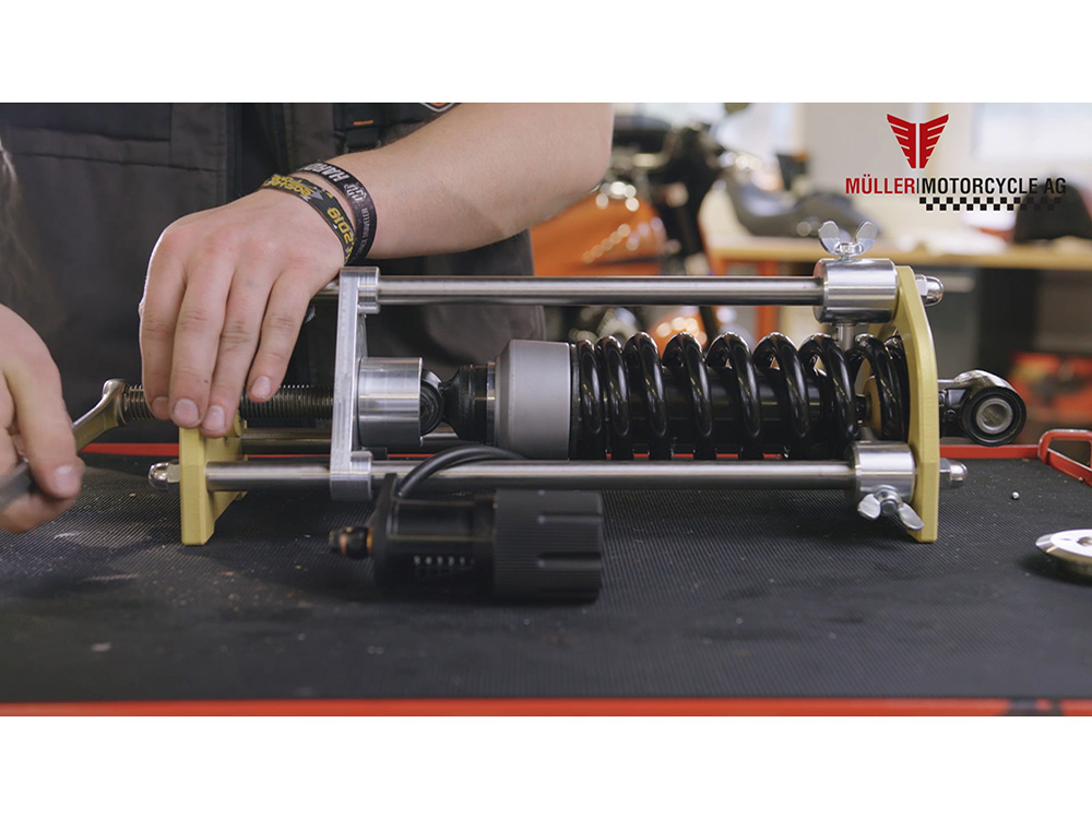 Our strut press is an important tool for all qualified workshop to install the Müller lowering device on Milwaukee-Eight models. The shock absorber is securely clamped in the press so that all steps can be carried out comfortably and easily. This makes mounting the lowering bracket a breeze.